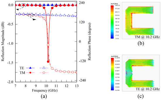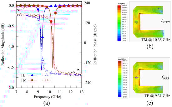 Simulation results of the U-shaped resonator with one ground via under TE and TM polarizations. (a) The reflection magnitude and phase versus operating frequencies under different polarizations. (b) The TM current distribution, which provides an even mode resonance at the frequency of 10.35 GHz. (c) The TE current distribution provides an odd mode resonance at a resonating frequency of 9.31 GHz.