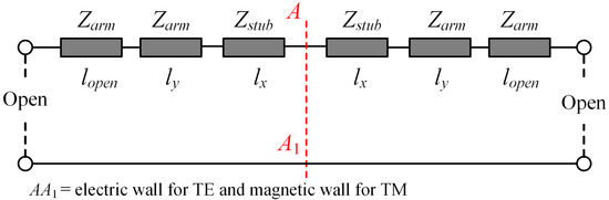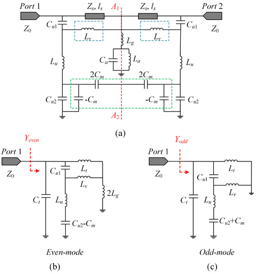 Since the equivalent circuit is symmetrical at the plane, even-odd-mode analysis can be utilized once more. Significantly, each short transmission line can be replaced by a series inductor with a value of and a shunt capacitor with a value of , where and are the permeability and the permittivity of the free space, respectively, and is the relative permeability of the substrate. For the even-mode resonance, an equivalent magnetic wall is inserted at the symmetry plane . The simplified equivalent circuit is shown in Figure 7b and the input admittance is expressed as: