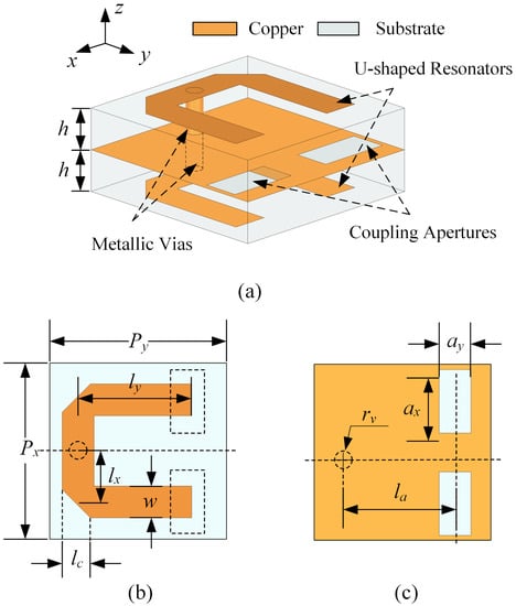 To meet the requirements for dual polarization isolation and signal bandwidth in wireless communication systems, the structure under discussion must incorporate multiple resonances and cross-coupling structures to achieve a flat transmission coefficient in the passband and multiple TZs outside of the passband. Figure 6 depicts the structure proposed in this paper with dual-frequency polarization selection characteristics. Two Taconic RF-35 substrates with a shared ground layer compose this structure. Each layer possesses a U-shaped, uniformly sized resonant ring that is grounded. On the ground layer, two identical coupling apertures are etched close to the open ends of the arms, where the electric field is at its strongest. In both the and planes the entire structure is symmetrical. The addition of the coupling aperture generates dual-port transmission characteristics and two additional out-of-band TZs. The physical parameters of this structure are listed in Table 2.