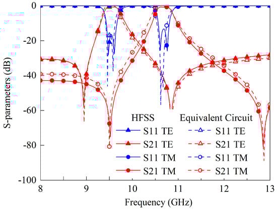 Figure 8 displays the results of the HFSS full-wave simulation and equivalent circuit calculations. With the exception of a minor disparity, the results are in good agreement. Table 4 provides the values for the synthesized circuit elements. The slight difference may be the result of ignoring the equivalent circuit of the U-shaped resonators’ coupling to the ground.