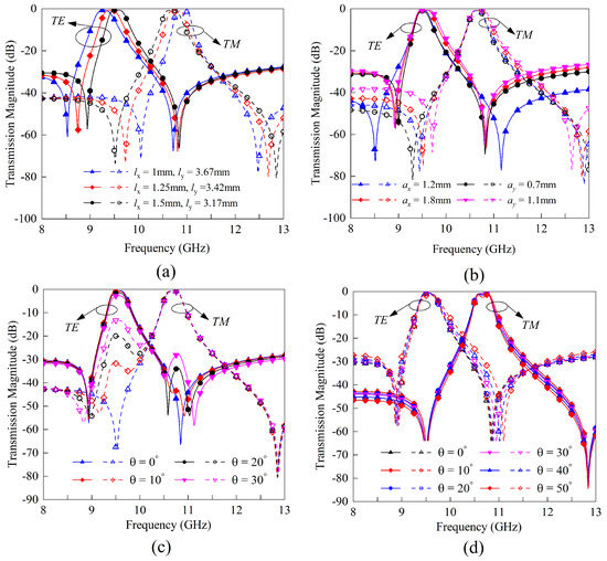 The effect of the geometric parameters and incident angle on FSS transmission magnitudes. (a) Different while the sum of and is fixed. (b) Different and . (c) Different incident angles in plane. (d) Different incident angles in plane.