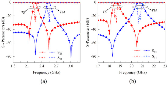 Designing the examples realized by utilizing the methods in Figure 10. The desired in−band minimum polarization isolation is 40 dB. (a) S−band design for indoor communication with center frequencies located at 2.35 and 2.55 GHz. (b) K−band design with center frequencies located at 18.7 and 21.6 GHz.