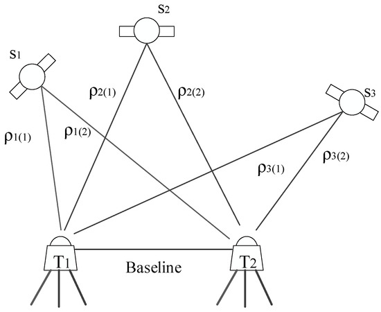 In Figure 3, S1–S3 represent the satellites. T1 and T2 are two receiving devices, one of which serves as the reference station and the other as the monitoring station.