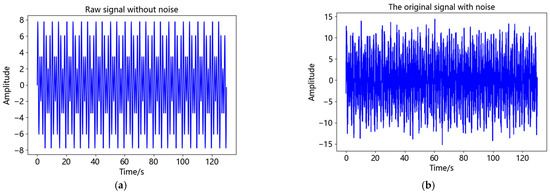 By comparing Figure 5a,b, it can be seen that after adding noise, the signal appears burr and the signal smoothness is weakened, indicating that noise will affect the correct recognition and use of the signal, therefore, it needs to be processed by filtering. After CEEMDAN of y(t), 11 IMF components and 1 residual component were shown in Figure 6. Equation (10) was used to calculate the correlation coefficients between each IMF component and y(t), as shown in Table 1.