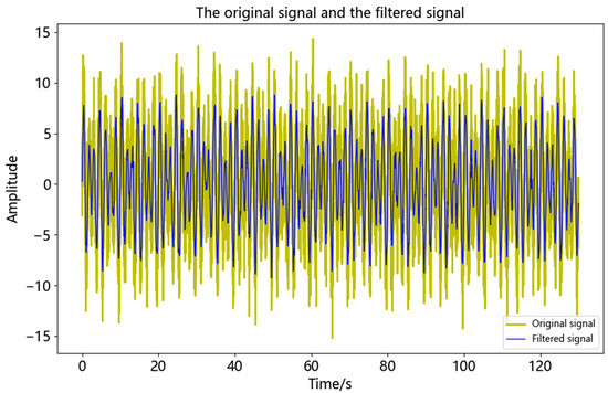 It can be seen from Table 1 that the first locally minimum IMF component of the correlation coefficient was IMF4, as such it was determined that IMF1~IMF4 were noise components, while IMF5~IMF11 were effective components. The comparison between the reconstructed signal and y(t) after processing by using the CEEMDAN-AWT method proposed in this paper is shown in Figure 7.