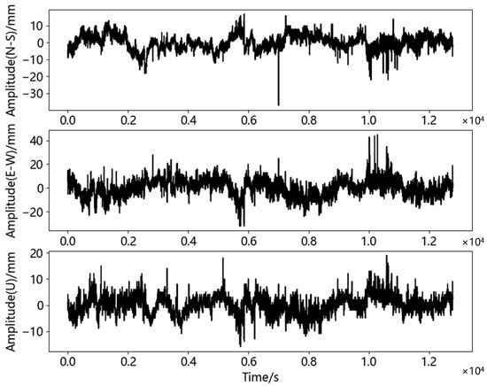 It can be seen from Figure 9 and Table 3 that the displacement data of the three directions were mainly concentrated near zero, in which the maximum value of the N-S direction was 16.926 mm and the minimum value was −37.074 mm; the maximum value of the E-W direction was 44.883 mm and the minimum value was −32.117 mm. The maximum value of the U direction was 19.080 mm and the minimum value was −15.920 mm. It can be seen from the Figure 9 that the maximum value occupied a small proportion column in the whole signal and did not appear continuously, and thus it was determined that there may have been gross error in this time series. In order to judge and remove gross errors, the commonly used criterion method was introduced, which was as follows [50]: