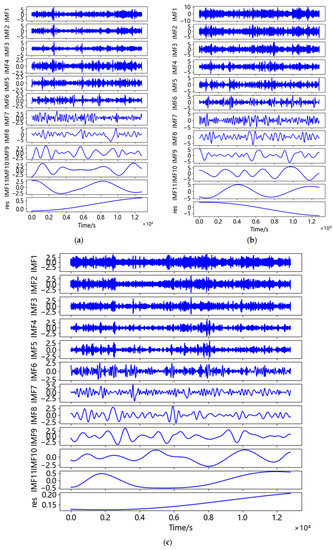 CEEMDAN decomposition of data in three directions: (a) CEEMDAN decomposition of data in N-S direction; (b) CEEMDAN decomposition of data in E-W direction; (c) CEEMDAN decomposition of data in U direction.