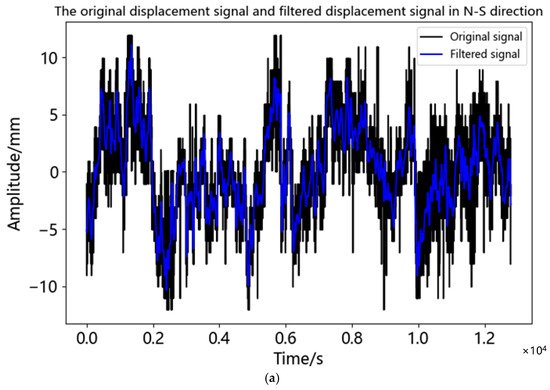 Comparison of original and de-noised signals in three directions of static test experiment: (a) Comparison of original and de-noised signals in N-S direction; (b) Comparison of original and de-noised signals in E-W direction; (c) Comparison of original and de-noised signals in U direction.