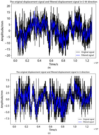 According to Table 4, the correlation coefficient 0.125 of IMF5 in the north-south direction was the first local minimum, while the first local minimum of the correlation coefficient in the east-west direction and the vertical direction was IMF4, which was 0.178 and 0.204, respectively. Therefore, in the N-S direction IMF1-IMF5 were noise components and IMF6-IMF11 were effective components. In the E-W and U directions IMF1-IMF4 were noise components and IMF5-IMF11 were effective components. The comparison between the filtered displacement time series and the original displacement time series was shown in Figure 11. As can be seen from Figure 11, after noise reduction the time series became smoother, the sharp points were suppressed, and the data accuracy was also improved. Under static observation after noise reduction, the displacement range in the N-S direction was −9.915~11.180 mm, the displacement range in the E-W direction was −15.856~15.833 mm, and the displacement range in the U direction was −7.409~7.780 mm. It can be seen that in addition to the east-west direction, the measurement accuracy of the instrument was satisfied in the north-south direction and the vertical direction. Under the influence of the multipath effect, the accuracy of the U direction was still less than 8mm, which could meet the needs of bridge monitoring.