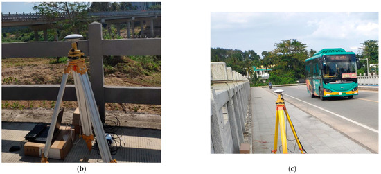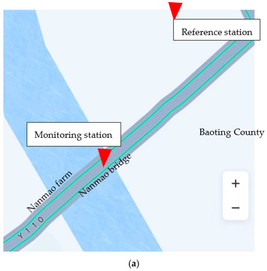 Layout diagram of bridge testing sensors: (a) Sensor’s layout diagram (background image from Baidu Maps); (b) Reference station; (c) Monitoring station.
