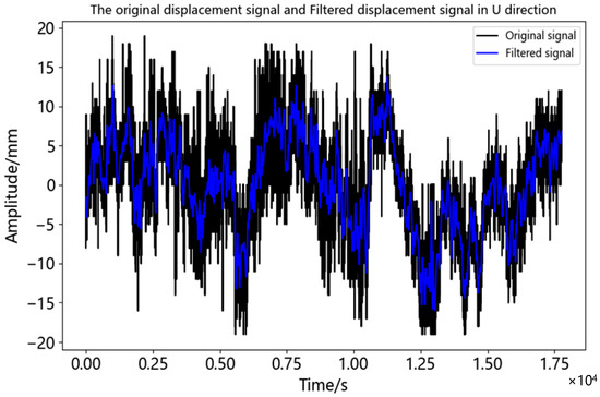 It can be seen from Figure 15 that the displacement time series became smoother and less sharp after de-noising. The correlation coefficient between the calculated filtered displacement time series and the original displacement time series was 0.899. The higher correlation meant that more details of the displacement response of the bridge were preserved, which can better reflect the deformation information of the bridge. According to Figure 15, the maximum value of displacement time series after noise reduction was 13.595 mm and the minimum value was −16.179 mm. The period of maximum displacement was about 12.500 s to 15.000 s in the time series, which was from 16:00 to 18:00 of the day. During this period, it was the peak time of commuting and the traffic volume was relatively large.