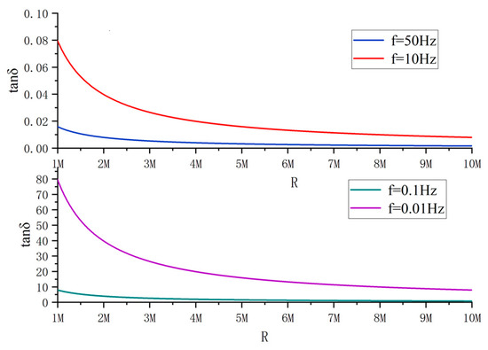 Theoretically, the original 6 kV voltage can be used as the signal source for measuring the dielectric loss angle in the coal mine 6 kV power supply system. However, under the industrial frequency condition, it is difficult to realize the effective separation of resistive and capacitive components because the difference between resistive and capacitive components of leakage current is too large. Figure 3 shows the relationship curve between tan δ and insulation resistance at different signal frequencies. It can be seen that when the cable insulation level changes, the lower the signal frequency, the greater the change in the value of tan δ; in other words, the higher the sensitivity of the dielectric loss angle to the monitoring of the cable insulation condition. Since the reactance value of the distributed capacitor is directly related to the frequency of the injected signal, if the reactance value of the distributed capacitor can be raised to a level similar to the insulation resistance, this will undoubtedly help to improve the measurement accuracy of tan δ. Based on this idea, more and more researchers have focused their research on new solutions for measuring tan δ via low-frequency signal injection.