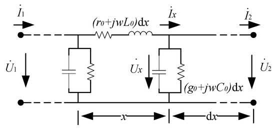 Figure 6 shows the equivalent model of a phase distribution parameter of the cable. Let the total length of the cable be l; dx is a certain micro-element at x distance from the first end of the cable, r0, L0 are the resistance and inductance values of the cable core unit length and g0 and C0 are the insulation conductance and distributed capacitance values of the main insulation unit length of the cable, respectively. and are the voltage and current at the head of the cable line, and are the voltage and current at the end of the cable line, and are the voltage and current at the distance x from the head of the cable, respectively. At point x, based on Kirchhoff’s voltage law, we have