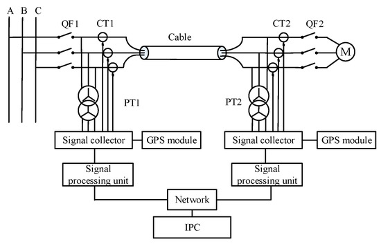 Figure 7 shows the measurement schematic of the double-end synchronous measurement method. The voltage and cable at the first and last ends of the cable are collected synchronously by the Wide Area Measurement System (WAMS). The WAMS consists of a global positioning system (GPS), a phase measurement unit (PMU), a communication network and a control center. The GPS is used for the first and last synchronous acquisition, and its role is to time the measurement equipment.