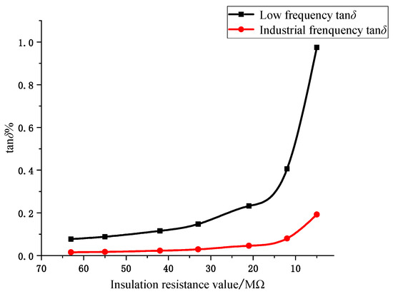 In order to reflect the advantages of online monitoring of dielectric loss angle using the low-frequency signal injection method, the dielectric loss angle tan δ of the single-phase insulation fault of the cable is measured at low frequency and industrial frequency, respectively. By changing the resistance value of the main insulation of the cable to simulate the operating condition of the cable with different aging degrees, the change in the dielectric loss angle tan δ when the insulation resistance decreases from 63 MΩ to 5 MΩ is calculated. The simulation results are shown in Figure 9. It can be seen from Figure 9 that although both industrial-frequency tan δ and low-frequency tan δ can reflect the aging of cable insulation materials, at the early stage of insulation aging, low-frequency tan δ undergoes certain changes, while industrial-frequency tan δ can hardly judge the aging condition of cable insulation; at the later stage of insulation aging, low-frequency tan δ can reflect the changes in the aging condition of insulation materials more sensitively, compared with industrial-frequency tan δ, and low-frequency tan δ online monitoring can better reflect the insulation level of the cable.