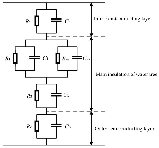 A simulation model of cable water tree aging was built according to the literature [20]. As shown in Figure 10, Rin and Cin are the equivalent insulation resistance and distributed capacitance of the inner semiconducting layer, Rout and Cout are the equivalent insulation resistance and distributed capacitance of the outer semiconducting layer, Rwt and Cwt are the equivalent insulation resistance and distributed capacitance of the water tree aging section, R1 and C1 are the equivalent insulation resistance and distributed capacitance of the water tree aging region, R1 and C1 are the equivalent insulation resistance and distributed capacitance of the parallel cable section and R2 and C2 are the equivalent insulation resistance and distributed capacitance of the series cable section in the water tree aging area. Since the equivalent impedance of the inner and outer semiconductor layers is much smaller than the equivalent impedance of the main insulation layer, it can be neglected in the simulation model.
