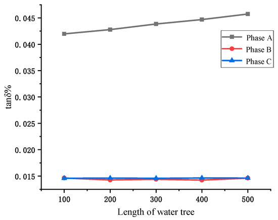 The simulation results of the cable dielectric loss angle tan δ for different water tree lengths are shown in Figure 11. From Figure 11, it can be seen that the tan δ value of the aging phase of the water tree aging varies with the growth length of the water tree, and the tan δ value of the non-aging phase remains basically the same. Therefore, the monitoring of cable water tree aging can be realized by monitoring the dielectric loss angle tan δ.