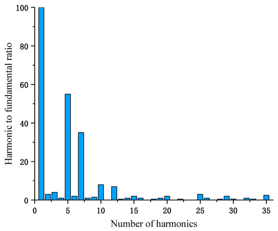 In order to make the simulation closer to the actual situation, this paper analyzes the harmonic content of the coal mine grid by means of a grid power quality analyzer. Figure 12 shows the harmonic spectrum of the coal mine power grid collected by the power quality analyzer. From Figure 12, it can be seen that the main harmonic contents in the coal mine grid are the fifth and seventh harmonics.