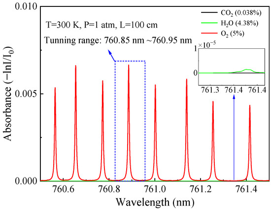 The main factors to be considered in the selection of an absorption line are the line strength, selectivity, and system cost [27]. O2 has a relatively strong absorption band near 760 nm. A spectral simulation of 5% O2 in this spectral range was conducted according to the HITRAN 2020 database [28] under a condition of 300 K, 1 atm, and 100 cm absorption length as depicted in Figure 1. Considering the sensor system should work normally in an atmospheric environment, the absorption of 0.038% carbon dioxide and 4.38% water vapor were also simulated. It can be seen that H2O and CO2 in ambient air produce little interference to the O2 detection in this wavelength, and the absorption line at 760.89 nm was selected as the optimal absorption line due to its strong line strength.