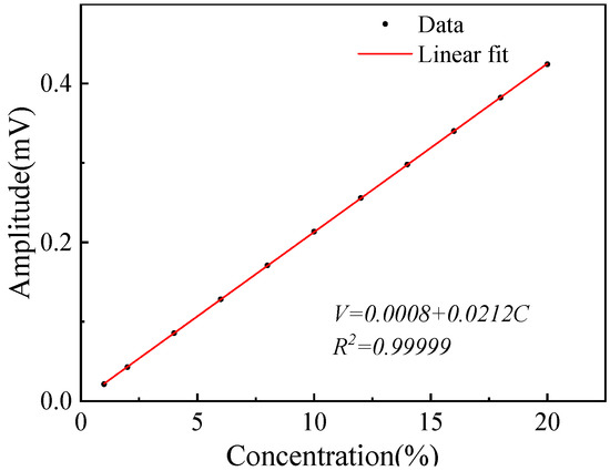 The relationship between the 1f normalized 2f (WMS-2f/1f) signal and the O2 concentration was simulated under the condition of optimal modulation coefficients. The WMS-2f/1f signals with a concentration of 1~20% were obtained by the simulation model, then the relationship was fitted as shown in Figure 3. The correlation coefficient is >0.999, which indicates this method has good linearity.