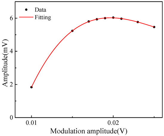 The experiments were conducted at pressure of 1 atm and temperature of 23 °C. The frequency of the triangular signal was 2 Hz. In order to scan across the selected absorption line at 760.89 nm, the amplitude of the triangular signal was set to 0.15 V. In order to determine the optimum modulation amplitude of the sensor system, experiments on different modulation amplitudes were conducted. Measured amplitude of the 2f signal versus the modulation amplitude were shown in Figure 6. It can be seen that the variation trend of 2f signal amplitude with modulation amplitude is consistent with the theoretical, and the maximum amplitude is ∼0.02 V. Thus, 0.02 V was selected as modulation amplitude.