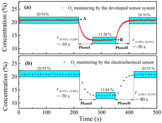The response time mainly depends on the gas cell volume and the gas flow rate. In order to determine the response time of the designed sensor system, a pump was connected to the outlet of the 50 mL gas cell, and the pumping rate was set to 400 mL/min. The experiment was divided into two phases: in phase I, the O2 concentration was changed from 20.9% to 13.3% starting from point A; and in phase II, the O2 concentration was changed from 13.3% to 20.9% starting from point B. The variation trend of the measured concentration was shown in the Figure 9a. At the same time, a commercial electrochemical O2 detector (SAFEGAS, SKY6000, Shanghai, China) was connected in series with the gas cell for comparison, and the results are shown in Figure 9b. The concentration curve indicated that the designed sensor response time is ∼50 s for phase I and phase II, which is shorter than the commercial electrochemical O2 detector. The trends of the two sensors were consistent, a finding which also verifies the effectiveness of the designed sensor system.