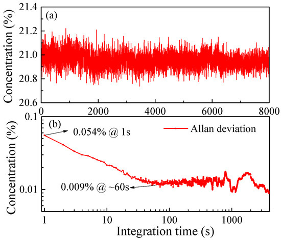 In order to test the stability of the system, measurements of an O2 sample with a concentration of 20.9% over time periods of ~2.2 h were performed. An amount of 8000 measured points was obtained as shown in Figure 10a. Allan variance analysis was performed to evaluate the MDL of the system. As shown in Figure 10b, the MDL is 0.054% under 1 s integration time. When the integration time reaches ~60 s, the optimal MDL is 0.009%.