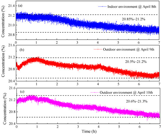 (a) Measured concentrations of O2 in indoor environment. (b) Measured concentrations of O2 in outdoor environment on 9 April. (c) Measured concentrations of O2 in outdoor environment on 10 April.