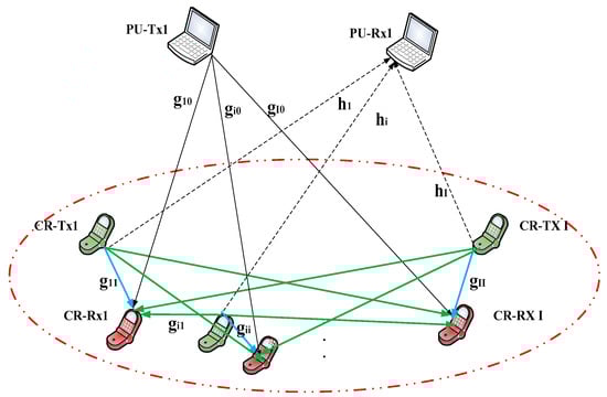is the effective channel gain of CR link . The collection of all SU transmitters that interfere with link is represented by . Where