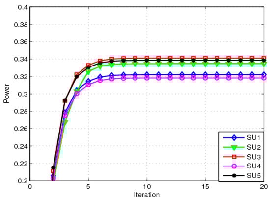 Figure 2 shows the transmit power of each SU for the NRA scheme with perfect CSI. The SINR parameter adjustment factor is . This means that the objective function is . Our goal is to minimize the sum of squares of the difference between the received SINR and the target SINR, which is a power allocation scheme of EE. The transmit power of each SU is observed to be in the range of 0.32 mW to 0.35 mW. The EE NRA mechanism can reach equilibrium rapidly. If we want to get higher throughput, we just need to adjust parameter . The larger is, the higher the throughput will be. Next, the simulation is discussed. The magnitude of is related to the interference power threshold and the maximum transmit power.