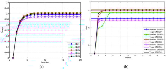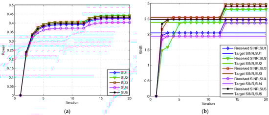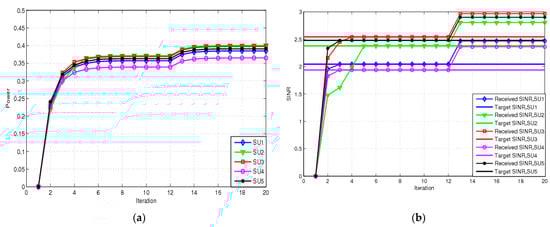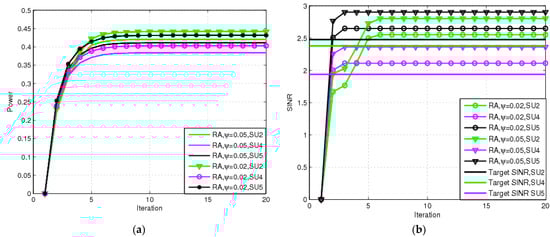 Figure 6 shows the received transmit power and SINR for different with the same channel disturbance. For comparison, the curves of increase, and transmit power and the SINR are also simulated in Figure 6a. From the figure, the greater is, the greater the transmit power will be. It is found that the values of power increase with the increase since a big factor enlarges the upper bound of the virtual SINR. The SINRs for the RA scheme are depicted in Figure 6b. As the increases, the received SINRs for each SU are increased to ensure the high throughput. Furthermore, there is a big gap between different for each SU, which demonstrates that the RA algorithm with high-SINR-parameter technology can greatly improve the system throughput.
