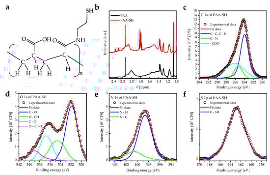 (a) Molecular structure of PAA-SH with a carboxyl-to-thiol ratio (1:4). (b) 1H NMR spectra for PAA and PAA–SH PEBs at pH = 7 measured at room temperature. NMR spectrum of PAA-SH shows the chemical shift of PAA and the -SH group. (c) Deconvoluted XPS C 1s spectra of PAA-SH PEBs. (d) Deconvoluted XPS O 1s spectra of PAA-SH PEBs. (e) Deconvoluted XPS N 1s of PAA-SH PEBs. (f) Deconvoluted XPS S 2p spectra of PAA-SH PEBs.