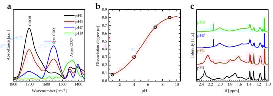 (a) FTIR absorbance spectra for carboxylic groups of PAA PEBs at pH 1, 4, 7, and 9 in the range of 1350–1800 cm−1 measured at room temperature. (b) The dissociation degree (α) calculated using of PAA PEBs versus pH value. The red line describes the sigmoidal fitting function for the data (c) 1H NMR spectra for PAA PEBs at the pH values of 1, 4, 7, and 9 measured at room temperature.