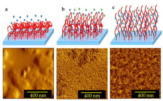 Schematic diagram in addition to 2D AFM images of the switching process of a polymer brush film: (a) collapsed brush at pH = 1; (b) swollen brush at pH = 7; and (c) stretched brush at pH = 9. The negative blue dots: Cl−; the positive green dots: Na+.