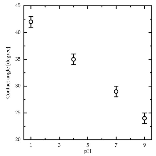 To better understand the effects of the dissociation of the carboxylic acid groups of PAA PEBs on the structure following pH variation, schematic diagrams in addition to 2D AFM measurements of PAA PEBs at different pH values (one, seven, and nine) are shown in Figure 3. At pH ~1, the initial state represents the brushes collapsed to the surface (with 1.5 nm roughness), with the domination of the carboxylic groups () (Figure 3a). This state represents the hydrophobic behavior of the PEBs. The addition of sodium cations through adding NaOH into the preparation solvent until the pH reaches seven leads to dissociation in the groups into groups of the upper molecules of the brushes. Consequently, the collapsed brushes transform into swollen brushes with 0.6 nm roughness (Figure 3b). The cations were unable to reach the deeper molecules of the brush film because of their high density. After pH = 9, the ion concentration is appropriate for reaching all molecules of the PEBs and consequently dissociates most of the groups. This event results in the prevalence of the groups in the brushes (Figure 3c). The domination of the negatively charged groups increases the electrostatic repulsion in the polymer chains and stretches the brushes with 0.3 nm roughness. In this state, the switching process completes, and the brushes swell. Moreover, the PEBs transform from a hydrophobic to a hydrophilic state (Figure 4) []. The contact angle of the PAA PEBs at pH = 1 was initially ~42°, which then decreased to ~24° with an increased pH value of nine.
