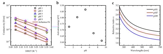 (a) Electrical conductivity of the PAA PEBs for different pH values as a function of 1000/T [K−1] fitted by the Arrhenius function to calculate the activation energy of the systems, (b) activation energy of the PAA PEBs deduced from the Arrhenius function as a function of the pH value, and (c) the refractive index spectra of PAA PEBs for the different pH values of 1, 7, and 9.