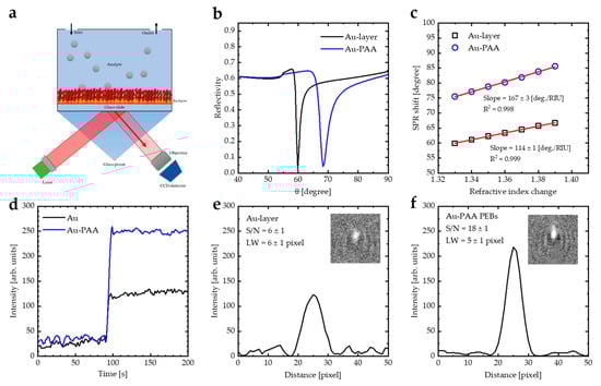 WF-SPRM was employed to record a series of 2D images demonstrating local spatiotemporal changes in intensity, which helps to detect the binding of nano-particles. Thiolated PAA (PAA-SH) was deposited onto the gold sensor surface using the spin coating method (Figure 6a). Figure 6b illustrates the theoretical reflectivity curves of the Au layer and Au-PAA layers, which were modeled via employing WINSPALL software []. Coating the Au layer with PAA PEBs increases the incident photon angle and the linewidth (LW). Figure 6c illustrates the shifting in the SPR angle for the Au layer and Au-PAA layers as a function of the refractive index values. The slope of the linear fit represents the sensitivity of the SPR sensor. The SPR sensitivity increases from 114 deg./RIU to 167 deg./RIU as the PAA PEBs appear on the surface of the gold sensing film. Additionally, the figure of merit (FOM) of the sensor, which is defined as the ratio of sensitivity to the LW, was calculated (Table 1) []. Coating the Au film with PAA PEBs increases the FOM from 80 to 89 [RIU−1].