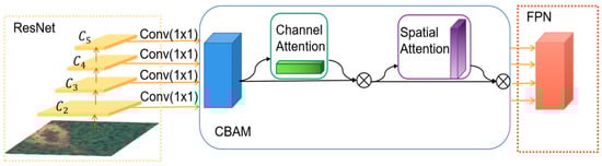 This paper observes that the texture features of landslide and non-landslide texture features in the dataset, such as the surrounding bare land and farmland, are easily confused. Thus, an attention mechanism is added to the 1 × 1 convolution in the FPN structure after extracting features in the stages of ResNet to strengthen the information extraction of the network for landslide features. The attention mechanism is essentially a mechanism that focuses on local information, which can locate the information of interest in the image and suppress useless information, and the results are usually presented in the form of probability maps or probability feature vectors. In this paper, the CBAM proposed in the literature [43], which is a hybrid spatial and channel attention mechanism, is adopted.