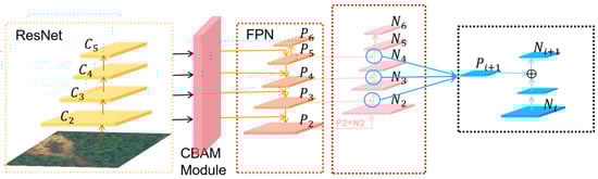Based on the above analysis, an improved FPN is developed in this study by adding channels that are connected backward from the bottom to the top, and the additional channels can help the network extract feature information at different levels, as shown in Figure 3, where ,,, and are feature layers of the FPN. The newly added bottom-up path merges the low-level feature map and the high-level feature map to generate a new feature map . The specific operation is described as follows: First, the feature map size of is reduced by downsampling the 3 × 3 convolution of with stride = 2 to obtain a feature map with the same size as . Second, each element of the feature map and each element of the downsampled feature map are added using the lateral join, and the new feature map is generated by processing the new feature map with a 3 × 3 convolutional layer of stride = 1. The specific operation is shown in Equation (2) and Figure 3.