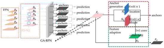 Since Wang et al. [44] suggest that the design of the anchor should not rely entirely on manual experience to set the number, scale, and proportion, first, an unreasonable setting will affect the detection results. Second, the anchor should not be set too densely, resulting in a very large computation. Last, the ratio of positive and negative samples of the anchor can easily be unbalanced, so there should be guidance in designing the anchor. GA-RPN was developed to generate anchors in a guided manner by using key points (center points) to predict anchor positions and sizes and then by refining the anchors.