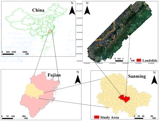 Figure 6 shows the monitoring area range and landslide distribution. Sanming had a landslide caused by heavy rainfall on 5 June 2019. UAV data were acquired on 12 June 2019, with the following specific indicators in Table 1. The landslides in the study area were mainly captured after heavy rainfall. According to Varnes’s classification [45,46], the main types of landslides are debris flow and debris avalanche inflows, and the main factors of landslide generation are strong surface water flow erosion and movement of loose soil or rocks on steep slopes due to heavy precipitation. Other causes of landslide formation may be weak or sensitive material ground cover in geological causes, excavation of slope or its toe, loading of slope or its crest, deforestation, irrigation in human causes, etc.
