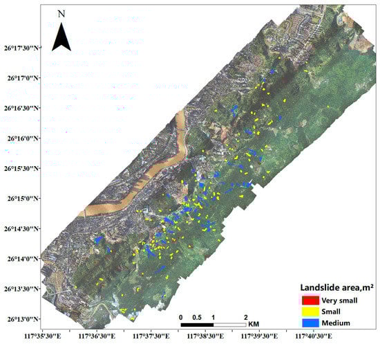 The total area of landslides in the study area is 316,738.58 , with an average area of 1314.28 . According to the interpretation results of UAV images, the maximum statistical disaster coverage area is 14,289.63 , and the minimum coverage area is 14.76 .