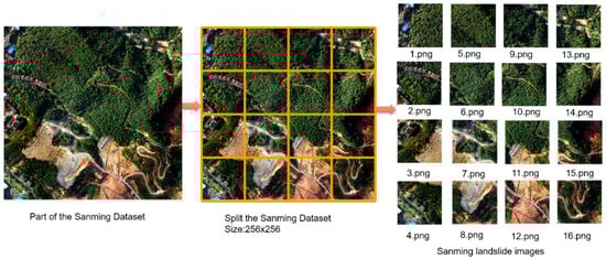 Considering the large size of the remote sensing images captured by the UAV, the model has a limitation on the input data size, so the images need to be cropped. To better reflect the texture features of the landslide and the recognition of the model, counting the area of all sample labels, according to the area distribution, we fix the size of the input to 256 × 256. Figure 8 shows a similar cropping process to cut the original image as well as the labeled images and construct the landslide dataset according to the requirements of the model. All the samples are divided into the training set, validation set, and test set in the ratio of 6:2:2, i.e., 1050 images are adopted as training samples, 300 images were used as validation sets to verify the optimized hyperparameters, and the remaining 300 images were used to test the model effect. The data enhancement technique allows the landslides to show different orientations, structures, and boundary shapes, thus increasing the size and diversity of the data [37]. Therefore, we enhance the training samples by flipping them up and down, left and right, etc. Finally, a total of 4050 landslide samples are obtained for model training.