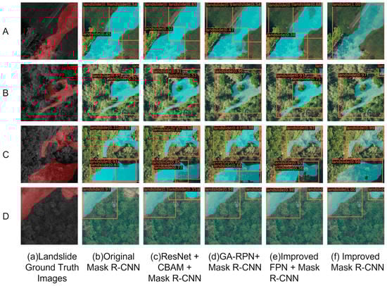 By comparing these five sets of detection results, we find that adding CBAM, which focuses more on channels and space, can focus more on the features of the landslide in the sample and mitigate the background interference; replacing RPN with GA-RPN can autonomously learn the shape of landslides for feature adaptation; adding bottom-up channels in the FPN structure combines the bottom location information with the top semantic information, which is more conducive to landslide information extraction.