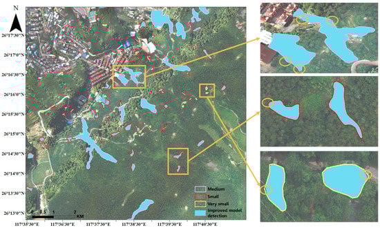 To further explore the improved model for landslide detection of different gradations, this experiment inputs the cropped images of the study area into the improved Mask R-CNN model for detection, imports the recognition results into ArcGIS software for raster data mosaic, keeps the parameters of pixel type, projection, and raster cell size of the raster data the same as the base image, and converts the raster data into vector polygons. The area of each landslide polygon after mosaicking was calculated to investigate the effectiveness of the improved model in identifying very small, small, and medium categories. The improved model identified 241 landslides successfully, but there were differences in the area distribution. Table 5 provides statistics on the relevant data (the results are retained to two decimal places), where the Total column is the total area of landslides, the total area detected by the improved model is 19,430.4 , 6.13% less than the actual area, and the overall detection accuracy of the model is 93.87%. The detection accuracy of the model for three different areas was 93.62%, 96.29%, and 92.90%. The model achieved the highest extraction accuracy in small grade, and slightly decreases in very small grade and medium grade, indicating that the model is more sensitive to the detection of landslides in small areas.