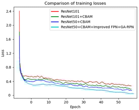 Comparing the training loss of ResNet at different network depths, four models, ResNet101, ResNet101+CBAM, ResNet50+CBAM, and ResNet50+CBAM+Improved FPN+GA-RPN, were trained based on the same dataset, and Figure 12 shows their training loss curves. It can be seen that CBAM enables the network to better capture the spatial information of the image to reduce the loss faster in training, thus improving the performance of the model. Meanwhile, ResNet50+CBAM reduces the number of parameters by half than ResNet101+CBAM, and the loss decreases a little faster. Therefore, ResNet50 is chosen as a suitable backbone for feature extraction.
