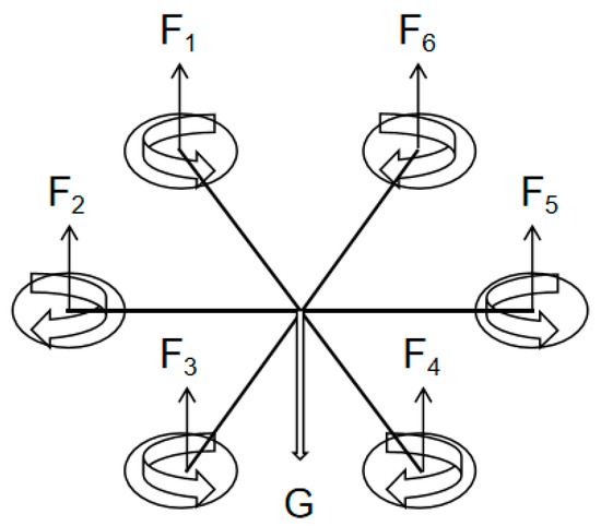 The UAV used in this work is a common six-rotor UAV, which has six propellers, and all its attitude and position control are achieved by adjusting the speed of the six driving motors. When the UAV is working normally, the three propellers are separated by 120 degrees rotate clockwise, and the other three propellers rotate counterclockwise, as shown in Figure 1. In general, the motion state of a six-rotor UAV is mainly divided into five types: hovering, vertical motion, rolling motion, pitching motion, and yaw motion. Only the hovering and vertical motions are simulated in this paper to study the impact on the anemometer because the two types often occur in measurement scenarios.