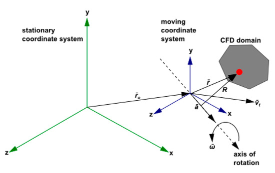 The MRF model is one of the multi-region calculation methods, which uses a steady-state approximation. Different rotation or movement speeds can be assumed in each region. The equations of the motion reference system are used to solve the flow problem in each motion area grid. On the interface of the computational domain, a local reference system is used to calculate the flux of the flow variables in one area and convert them to adjacent areas. The schematic diagram of a typical MRF system model is shown in Figure 2. It is a coordinate system that rotates at a stable angular velocity for a stationary reference system. The origin of the rotating system is positioned by the position vector .