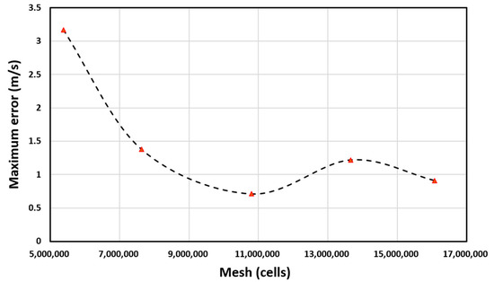 In this paper, the geometric model is very complicated, there are small gaps between the rotating area and the static area. To better express as many detailed areas as possible, an unstructured grid method is used for numerical simulation calculations. For the calculation of the external flow domain of CFD, the larger the flow domain, the smaller the interference of the external flow field boundary on the flow field calculation. This requires the flow field to be set as large as possible during the calculation. However, a large computing domain needs to consume too many computing resources. When the calculated flow domain size reaches a certain range, the calculation accuracy remains stable. Before the formal simulation, we conducted a grid independence test to ensure the optimal grid size and distribution while maintaining calculation accuracy. The mesh size of the area where the airflow changes drastically and the area close to the surface is set to be smaller, and the mesh size of the area where the airflow is stable to be larger to keep the accuracy of calculation and save the calculation resources. We initially divided 5,376,248 mesh cells roughly according to the above rules, calculated the maximum wind speed error, and then refined the entire mesh four times. The final grid-independence test result is shown in Figure 6. The red triangle in the figure represents the number of grids divided in our five simulations and the corresponding maximum error.