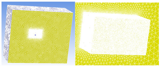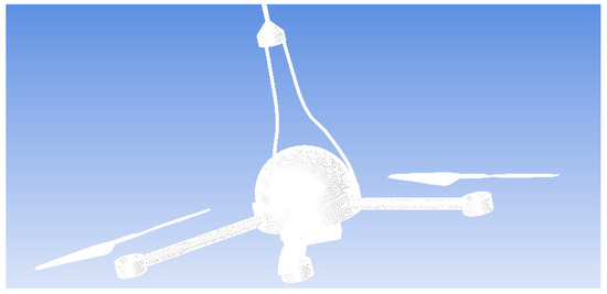 According to the results of the grid-independence analysis, we ultimately used 10,803,973 grids for subsequent simulations. The dynamic calculation area is selected to cover the adjacent area of the propeller blades, as this area has the most significant impact on the air motion related to the rotation of the propeller. After further increasing the calculation area, the simulation results do not show significant changes, but the calculation time greatly increases. Therefore, after considering the calculation amount and simulation accuracy, we choose the adjacent area of the propeller blades as the dynamic calculation area. The external flow domain selected in this paper is shown in Figure 7. The “encryption area” in Figure 7 refers to the outer region of the “computing domain”, which is usually used to avoid the influence of boundary effects on the calculation results and to improve the computational efficiency. Since the “computing domain” can be divided into multiple regions for parallel computing, adding an external “encryption area” can expand the range of the computing domain, thereby improving the accuracy and efficiency of numerical simulation. The size of the flow domain is about eight times the size of the UAV simulation model. Due to the symmetry of the UAV model, symmetrical boundary conditions are used in the calculation, and only half of the UAV model is calculated for the flow field, which saves computing resources without sacrificing calculation accuracy. The mesh diagram of the UAV is shown in Figure 8. The copter has a length of 1 m and a width of 1 m, and each blade has a length of 30 cm and a width of 5 cm. The anemometer is located at a height of 5 cm above the rotor. The number of mesh cells here is 3,689,216.